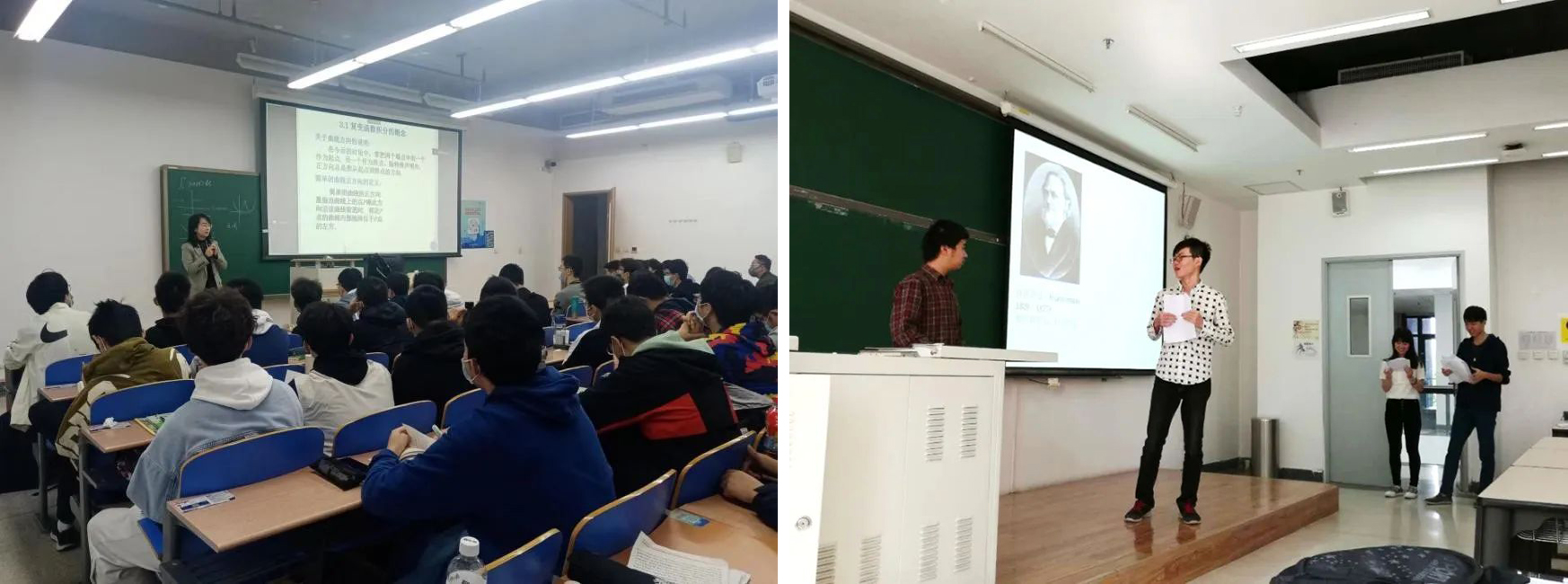 左:陈玉丽《复变函数》的教学课堂;右:《复变函数》由同学主讲的翻转微课堂
