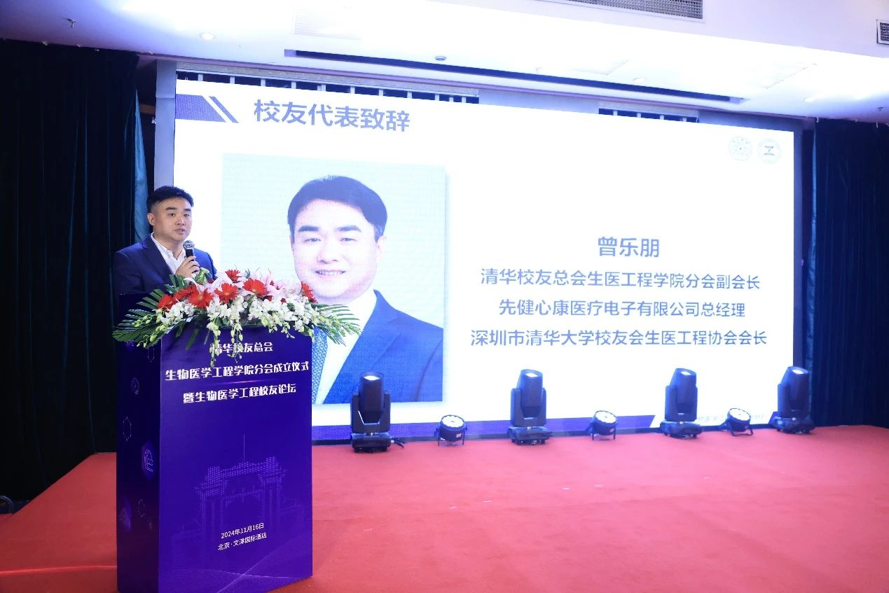 清华校友总会生医工程学院分会副会长、深圳市先健心康医疗电子有限公司总经理曾乐朋作为校友代表致辞,表示生物医学工程的产业化不仅需要技术研发的持续突破,更要与临床医学、材料科学、工程技术、人工智能,甚至金融与法律等多个领域深度合作,既需要勇敢的探索者,也需要携手同行的伙伴。他希望校友分会成为温暖有力的大家庭和创新合作的桥梁,并希望广大校友积极回馈生物医学工程学院,共创学院辉煌未来。