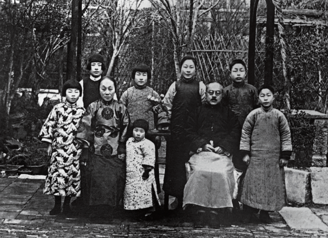 1927年冬摄于苏州老宅的杨家全家福。七妹杨桼(音同漆)、八妹杨必站在母亲唐须嫈(音同英)两旁,小弟杨保俶站在父亲杨荫杭身边。后排左起为三姐杨闰康、杨季康(杨绛)、大姐杨寿康和大弟杨宝昌。此时二姐杨同康已过世。