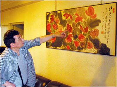 打开门,一切都是汪先生生前时候的模样,他的子女并没有动过,只是周末过来收拾收拾。在餐厅里,望着餐桌边墙上的那幅荷花图,还是十八年前的样子。大朵大朵的荷花,有十几朵,画面鲜艳极了。老人总是喜欢鲜艳的东西,齐白石晚年也是。过去从没有认真地欣赏过。先生去世后,也来过两次这里,可多是酒后,看了之后也没有留下印象,这一次得好好看看。总的感觉屋子太小了。这比住蒲黄榆已大了许多,可是现在看来,还是太小了。因此这幅荷花图也太小了(汪先生画时肯定是根据屋子的比例的)。在画的右手先生题了一段款: