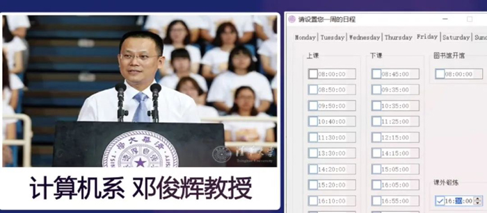 再来看这张图,这是计算机系邓俊辉教授。邓老师是教学能手,平时就开发了各种各样的教学软件供同事们免费使用。这次疫情期间,邓老师的开发技能又再次刷屏。他把清华各种上下课铃声集合到一起,做了一个小程序。不管是在北京,还是在湖北,甚至是海外,只要你电脑里装了这个小软件,立马让你感受到在教室里的感觉。让我们一起来听一段熟悉的声音。