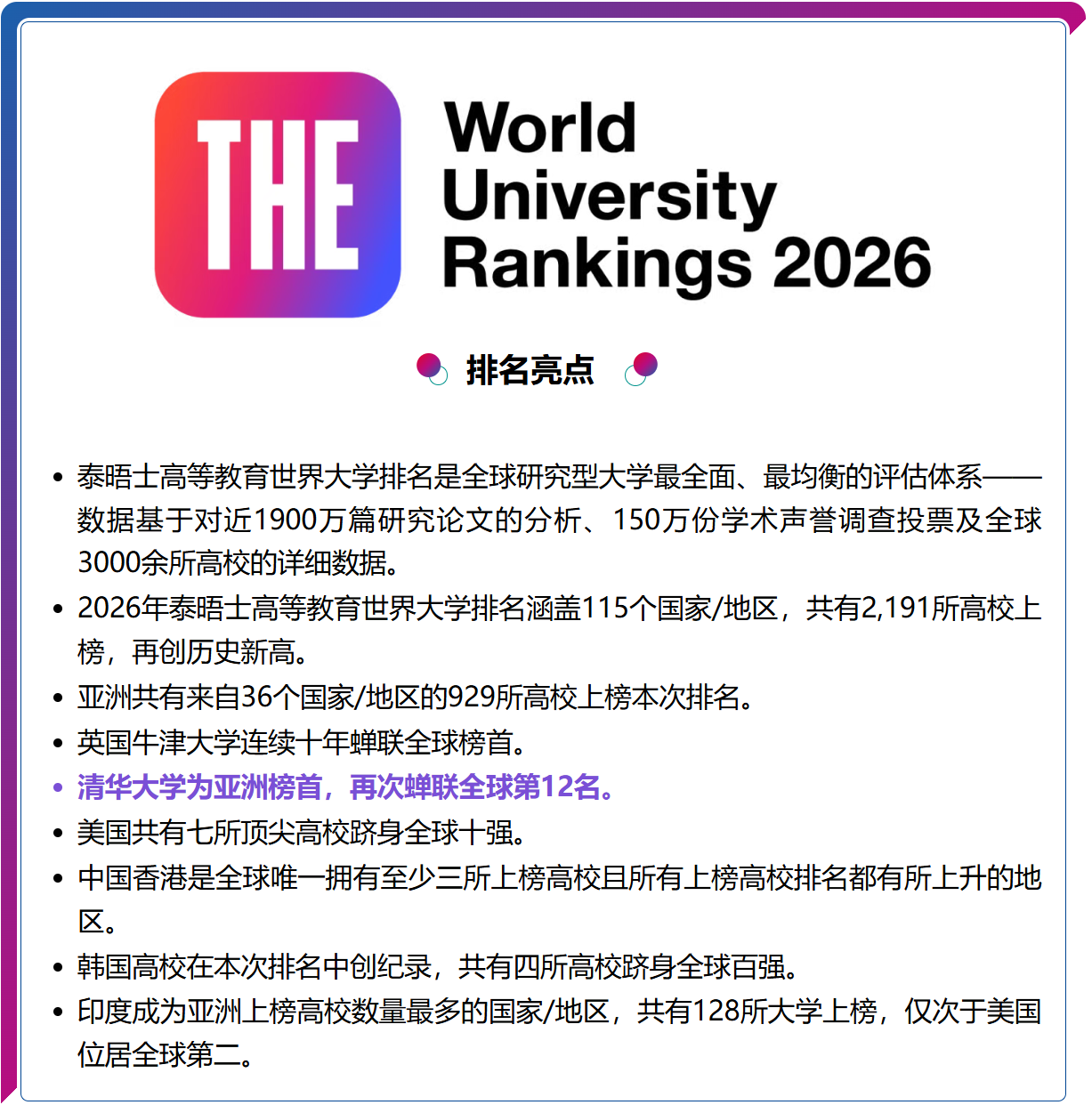 6月17日,U.S.News官网发布了2025-2026年度全球最佳院校排名。清华大学位列全球大学第11,亚洲第一,创下该排名的历史最佳,也是唯一进入前20名的中国高校。在近年来的U.S.News全球最佳院校排名中,清华大学已连续5年保持中国高校排名首位。U.S.News 2025-2026年度全球最佳院校排名TOP20U.S.News2025-2026年度全球最佳院校排名TOP50的中国高校今年共有15所中国高校进入百强,较去年13所高校有所增加。清华在中国高校中排名最高...