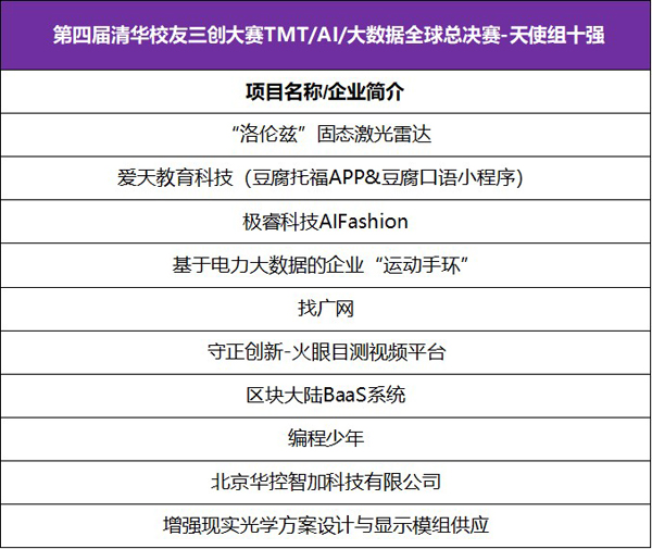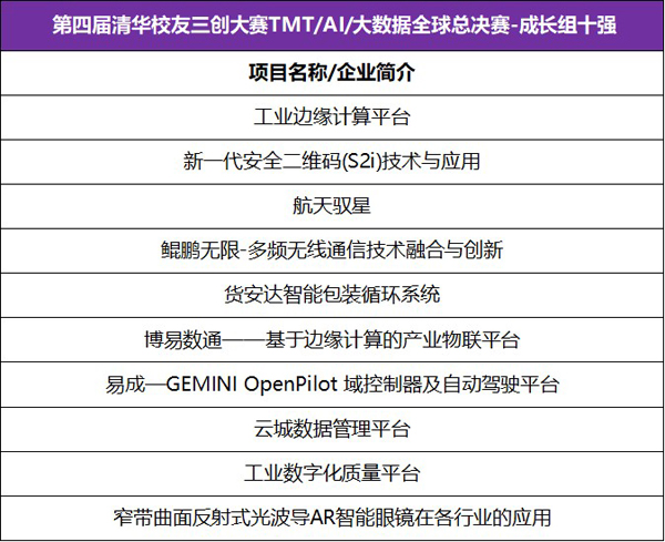 第四届清华校友三创大赛TMT/AI/大数据全球总决赛获奖项目名单