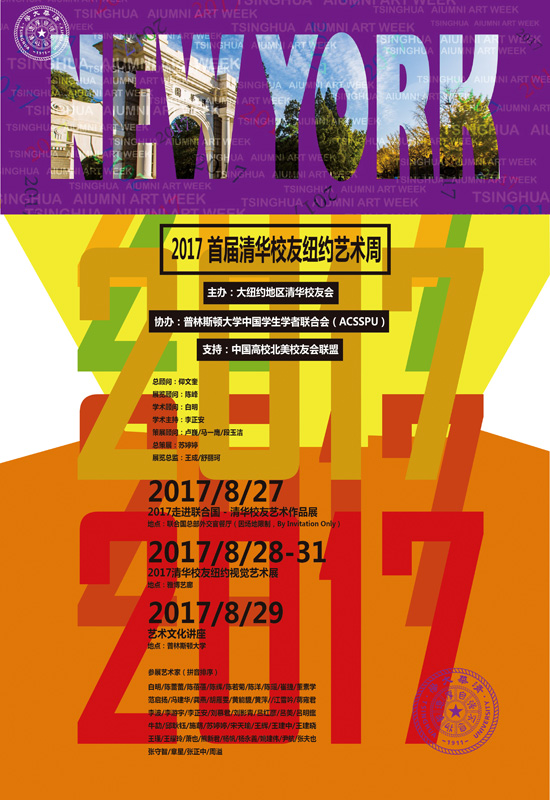 2017年8月31日,由大纽约地区清华校友会主办、普林斯顿大学中国学生学者联合会(ACSSPU)协办、中国高校北美校友会联盟支持、中国山东威海爱威瓷业有限公司赞助的《2017年首届清华校友纽约艺术周》在纽约圆满落下帷幕。本次艺术周共分为三大板块,分别是《2017走进联合国—清华校友艺术作品展》、《2017清华校友纽约视觉艺术展》、《艺术文化讲座》。