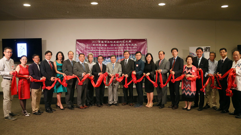 艺术周开幕酒会暨《2017走进联合国—清华校友艺术作品展》27日在联合国总部举行,来自美东地区的清华校友和各界嘉宾逾百人出席了开幕式活动。中国常驻联合国代表团科技参赞刘俊、中国驻纽约总领馆教育参赞徐永吉、教育领事王文华、大纽约地区清华校友会董事长暨中国高校北美校友会联盟理事长仰文奎、联合国大会事务部资深同声传译暨联合国太极文化学会理事陈峰、艺术周学术主持暨清华大学美术学院教授李正安、大纽约地区清华校友会董事宿大庆、罗建刚、徐向东、联席会长王成、清华企业家协会国际副主席张鸿飞、纽约国际领袖基金会主席、中国高校北美校友会联盟创会会长黄亚村、副理事长颜为民、金路德、全美华人金融协会候任主席刘力、北美中国书法协会会长沈新德、雅博艺廊总顾问Millie Chang、大纽约地区清华校友会副会长暨艺术周策展人苏婷婷、中国山东威海爱威瓷业有限公司代表熊刚等为开幕式剪彩。徐永吉、刘俊和仰文奎3人先后向现场的艺术家们颁发了艺术周参展证书。应邀出席联合国开幕式酒会的嘉宾还有来自北美兄弟校友会的代表,包括:北大、交大、复旦、浙大、天大、南开、人大、同济、武大、中财、南大、中大、华南理工、北医、上医、上外等北美校友会。