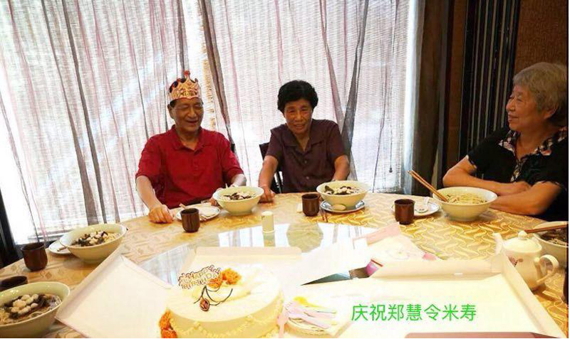 筹备组特别安排大家在奎元堂吃长寿面,寓意大家都已跨过了全国平均寿命大关而迈入了耄耋老人的行列,祝愿大家一起奔向2021年毕业六十周年再聚清华园。不曾想席间又添加了一段插曲:几个同学悄悄地从网上购买了生日蛋糕,并要求快递公司于x时x分直送奎元堂,特地为今年满八十八的郑慧令贺米寿,他是调干生,是我们的老大哥。一时间戴寿星帽、许愿、吹蜡烛、切蛋糕……那场面好不温馨,好不热闹哟!