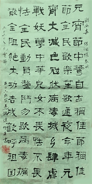 元宵节,中华自古称佳节。称佳节,全民欢乐,笙歌通夜。今年元宵大减色,千门万户守家宅,守家宅,冠状病毒,城乡肆虐。
