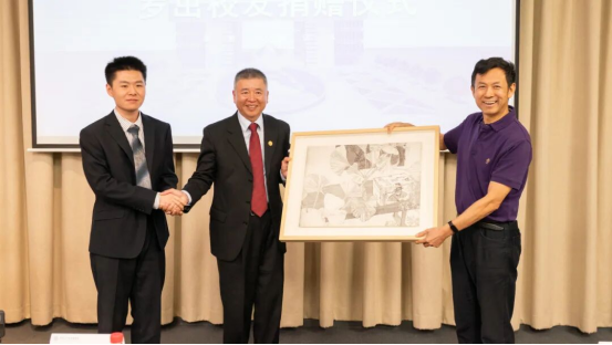 清华大学校务委员会副主任、清华校友总会副会长史宗恺为罗茁校友颁发捐赠证书。清华大学科学博物馆馆长吴国盛向罗茁校友赠送专门定制的纪念品——由清华大学美术学院绘画系的本科生、科学史系辅修生黄伯雍绘制的一幅版画作品。