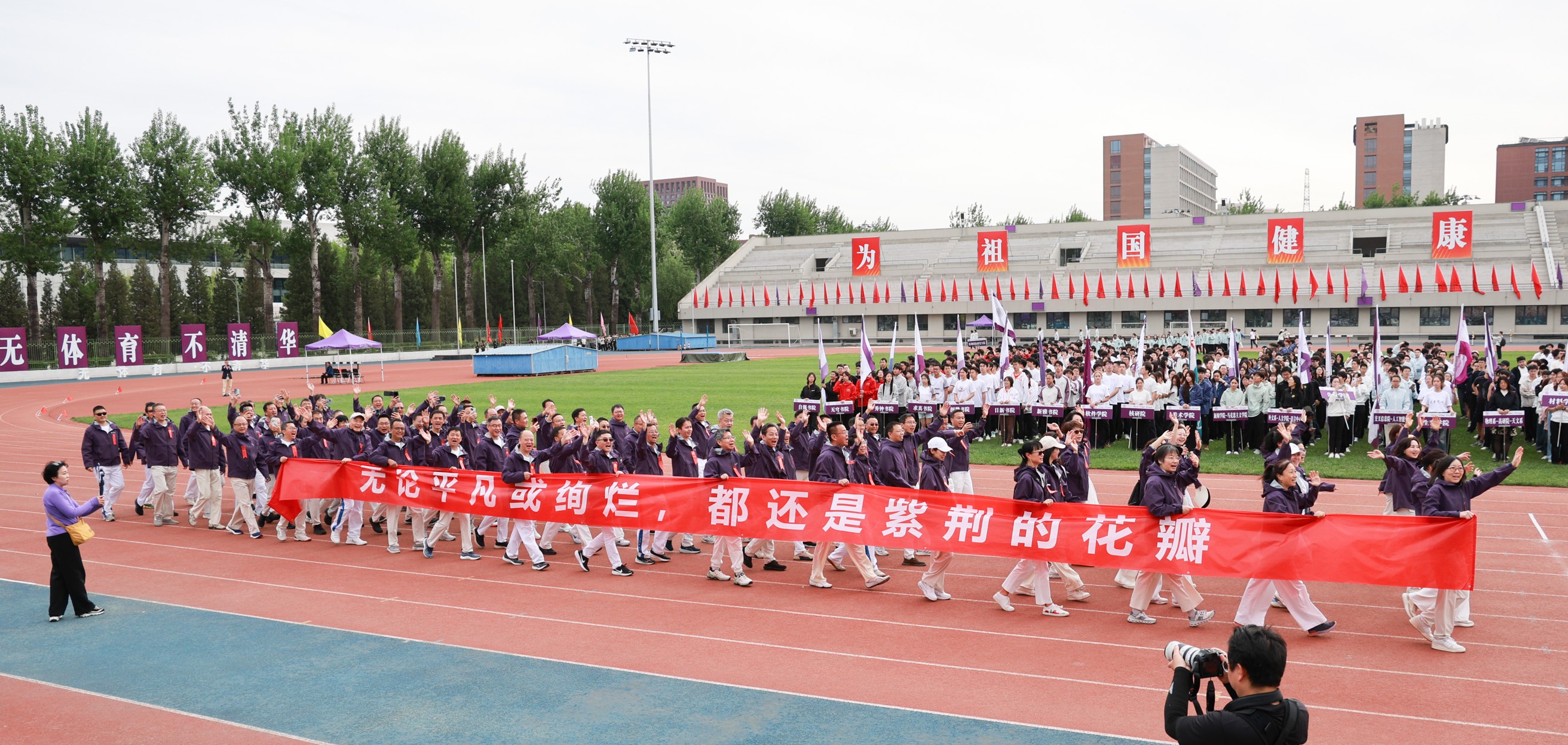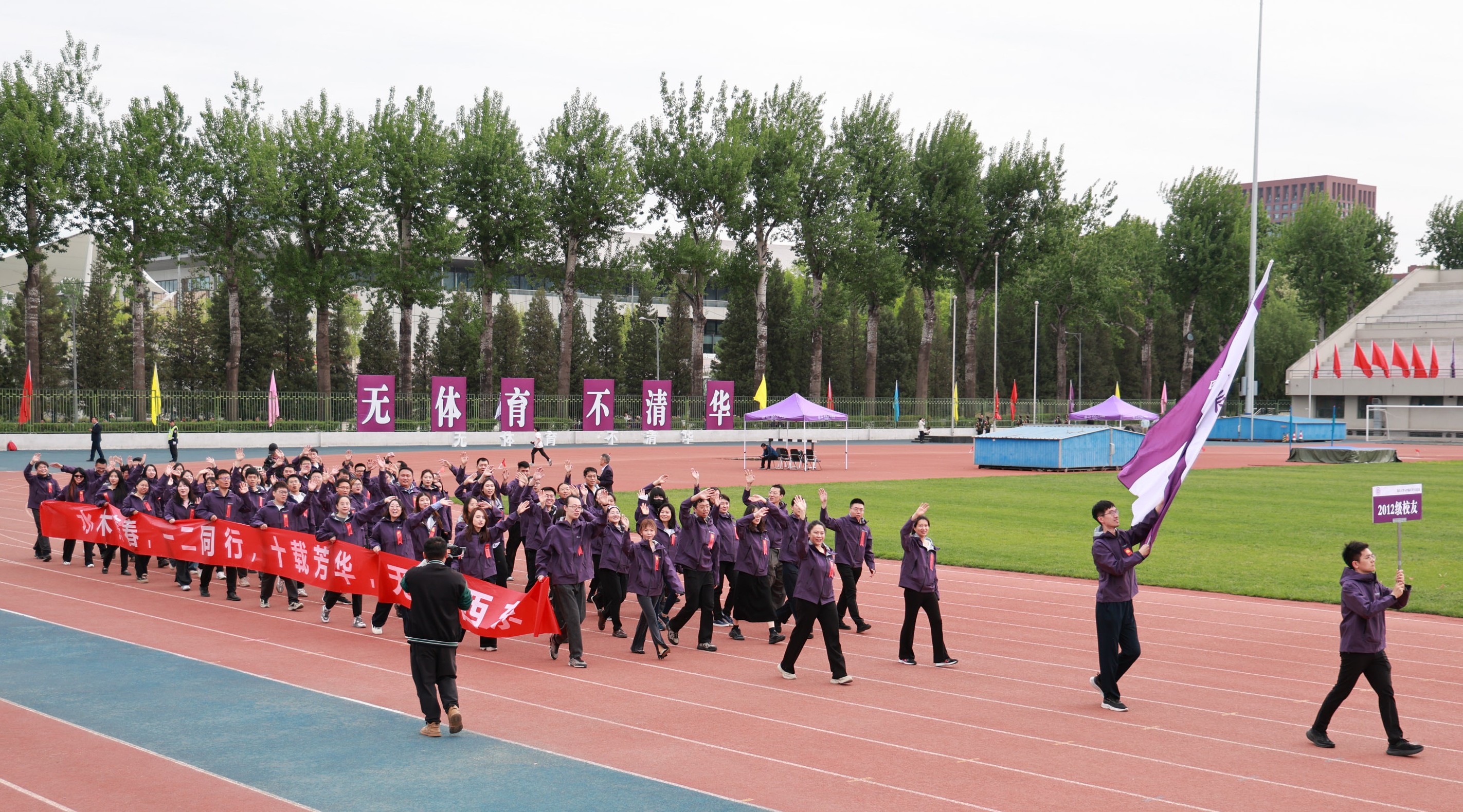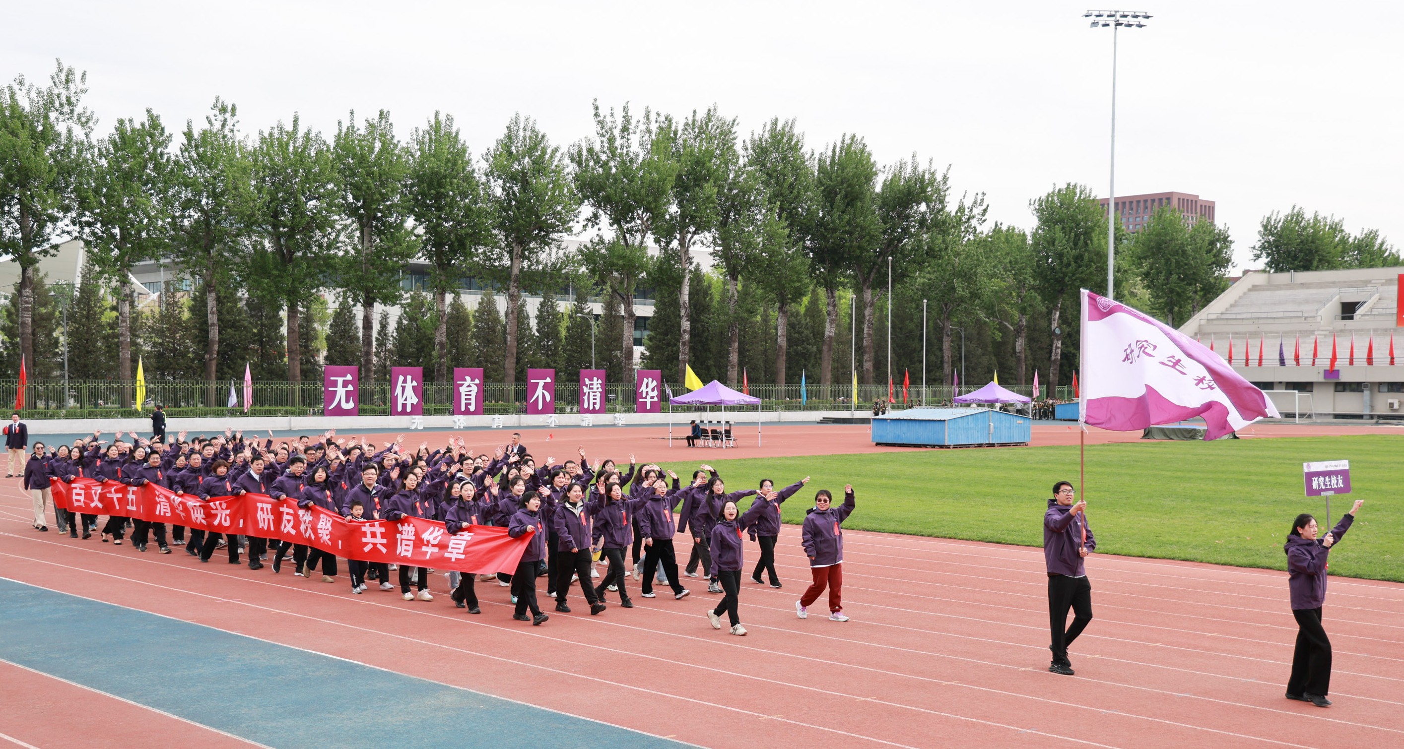 4月25日上午,清华大学第六十四届“马约翰杯”学生田径运动会开幕式在东大操场开幕,在入场式中,547名校友组成的五个校友方阵压轴出场,成为开幕式上的靓丽风景。