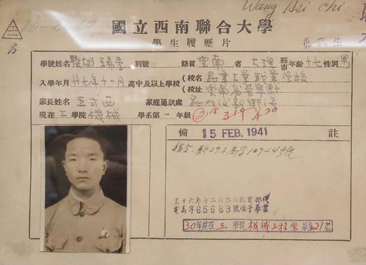 王希季在西南联大的学籍卡