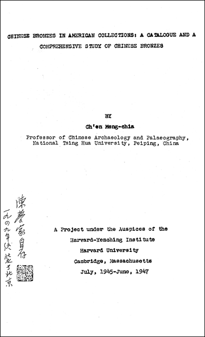 “陈梦家1944-1947年间在美国以一人之力调查中国铜器后,留下了英文稿,共有两部分组成:第一部分是《中国铜器综述》,第二部分为图录。出版的过程非常坎坷:陈先生留下了英文打字稿和图片,原计划在美国出版,但因为种种原因搁置下来,留在美国的书稿不知所踪。陈先生带了副本回国准备出版,结果因划为‘右派’被搁置,图录部分一直到1962年才由科学出版社出版,书名被更改为《美帝国主义劫掠的我国殷周铜器集录》,著者姓名也被隐去。此版本现在拍卖市场上价格很高。而《中国铜器综述》淹没72年后,直到现在才面世。”