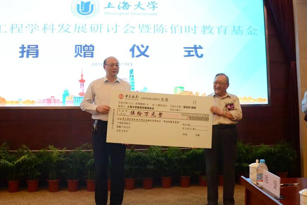 陈老捐出个人积蓄50万元后,他的学生、上海新航星投资集团有限公司董事长何志明校友,也以等额配捐50万元,加入上海大学教育发展基金会设立的“陈伯时教育基”。