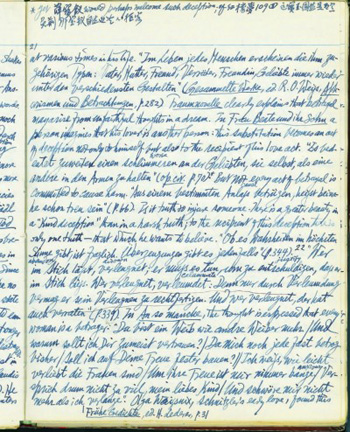 除了《谈艺录》《管锥编》等学术著作,钱先生还留下了大量的读书笔记:《容安馆札记》 三千余页、《中文笔记》 一万五千余页、《外文笔记》三万五千余页。这些读书笔记从上世纪三十年代记到作者1998年逝世,跨越了六十余年,两万多日。这六十余年中还包括作者辗转流离的年代、身不由己的年代和疾病缠身的年代。不仅如此,今天所见的读书笔记已不是完整的原貌,可以看出当中有遗失的部分,有作者专门编辑整理和重新打印的部分。更惊人的是全部笔记都有作者反复阅读、勾画评点的痕迹。也就是说,这些书和读书笔记,作者读了不止一遍,记了不止一遍。恐怕所有面对这个“人间奇迹”的人都不禁会想:六十余年的时间,每天要读多少书,记多少页笔记才能留下如此规模的知识宝库? 这个问题,怕不只是一个估算那么简单。如丁宏为老师所言,在《外文笔记》前,可以真正体会一下“读书”二字。