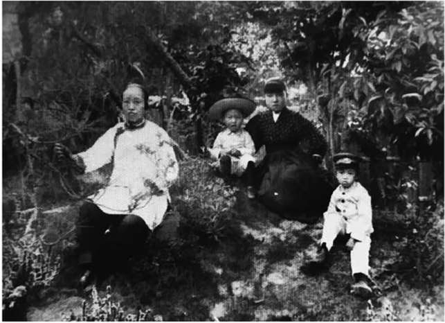 1908年,李蕙仙与孩子们一起在日本山间游玩小憩。右起:梁思成、梁思顺、梁思永、李蕙仙