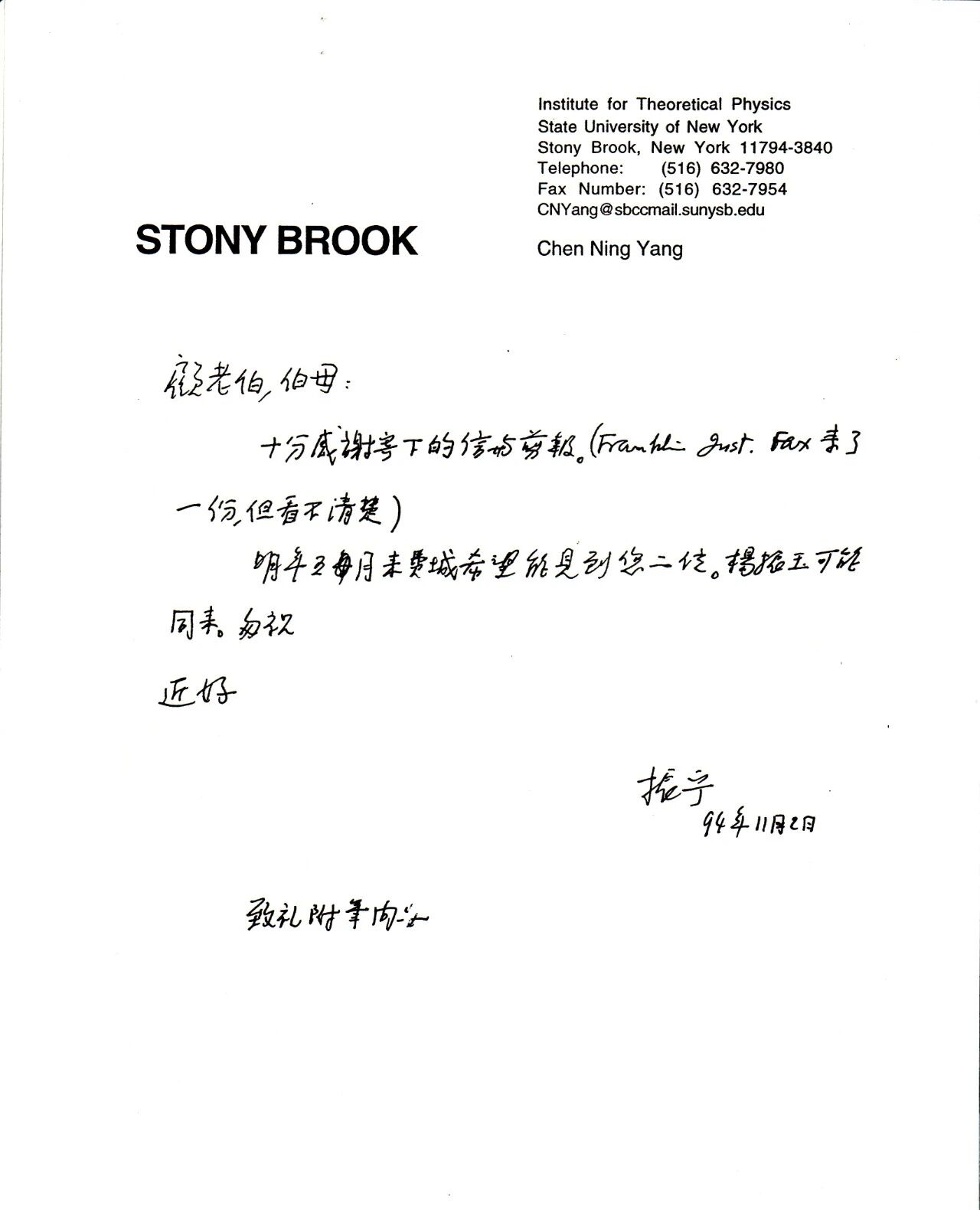 1966年,杨振宁先生离开普林斯顿,前往纽约州立大学石溪分校,创立理论物理研究所。虽相隔更远,但他仍抽时间到费城看望我祖父。1994年11月2日,他在“理论物理研究所”的信笺上写下: