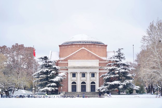 视频中清晰可辨的是礼堂外被皑皑白雪所覆的绿色草坪。随着秋意的退场,广场周遭的树木大多变得光秃秃的,有些树的叶子尚还泛着微黄,但已是被寒意催逼得几近干枯。树的枝桠间,还粘连着星星点点的雪粒。礼堂右侧的桧柏树,在雪花的映衬之下宛如圣诞树一般,美极了。