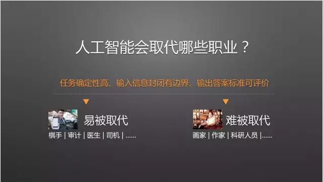 我们会好奇哪些职业会被取代,倒过来讲就是哪些行业是创业的机会?其实下围棋的程序,如果把程序突然间跟AlphGo说,对不起,我们改点规则,我们把棋盘放成21×21,放大两个,机器肯定就不会下棋了,但是李世石一定会下。所以机器能做的事情是非常非常有限的。如果说这种题目非常地清晰,就像下围棋一样的,输入的信息就局限在有限的输入里面,在有限的输入下,有规则清晰的输出,在这种情况里面,机器都会把人给取代。所以任务的确定性高,输入的信息封闭有边界,输出答案是标准可评价的。为什么呢?棋手已经有了,或者医生、司机、股票的高频交易,像这种情况下输入的信息非常有限,在信息非常有限的情况,机器就把人给应了,因此这里面是机会。难被取代的行业,像创造性的东西,画家、作家、科研,因为你这样一个思考的问题是没有一个边界的,对机器而言,今天是完全找不到机会去努力的。分析一下哪个行业让机器更有机会参与,让人做哪些行业。