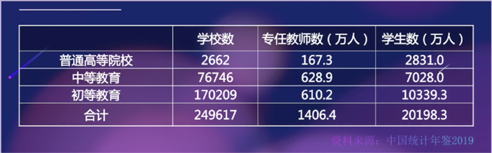 请大家看这张图。这是最新的全国学校、教师和学生的统计数。如果全部线上开课,意味着这是一场涉及到1400多万名教师和超过2亿学生的大规模线上教学试验。疫情,让老师和学生,前所未有地通过互联网连接在一起。