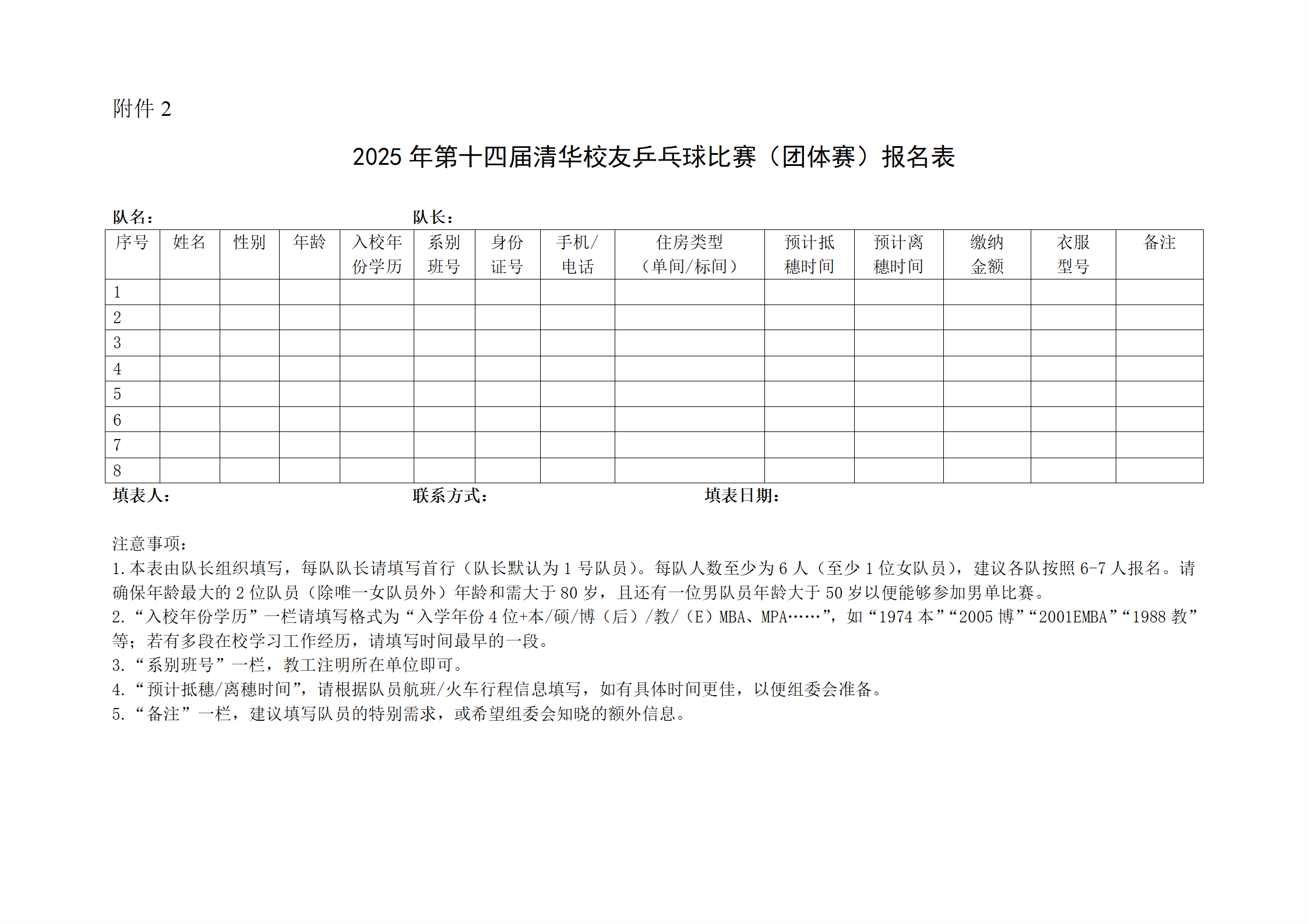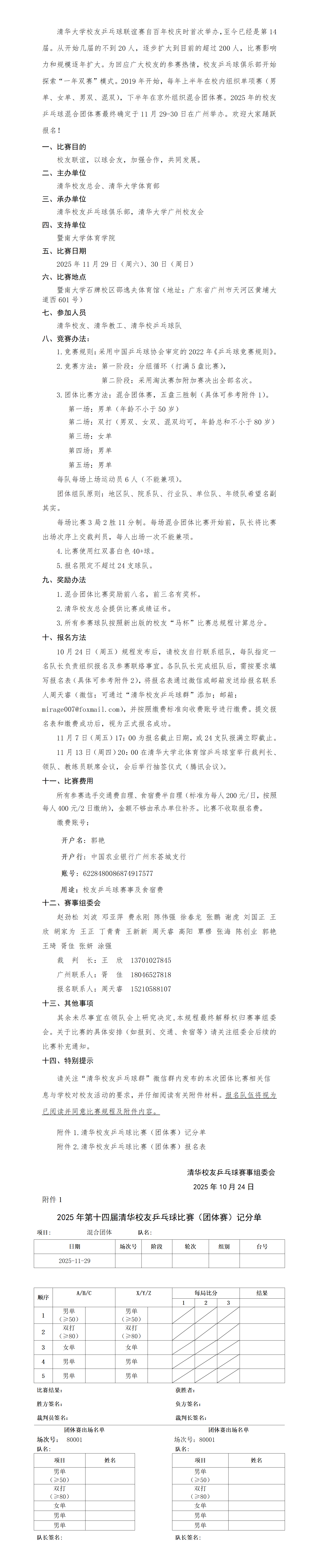 一、比赛目的弘扬和传承清华体育传统,以球会友,促进交流,共同发展。二、比赛组织主办单位:清华校友总会、清华大学体育部承办单位:清华校友乒乓球爱好者俱乐部赞助单位:上海欣诺通信技术股份有限公司世纪二千网络科技有限公司三、比赛时间与地点比赛时间:2025年4月26日(周六)比赛地点:清华大学北体育馆四、参赛资格1.已经毕业的清华大学校友,且符合下列条件之一者。(1)在“清华人”小程序上有校友记录;(2)在清华...